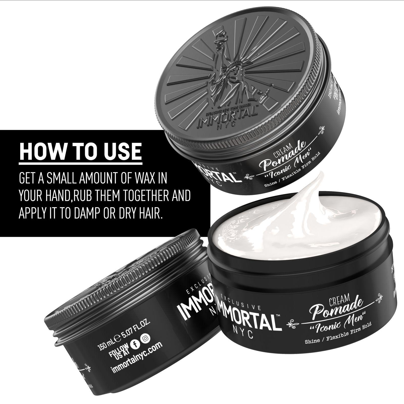 Immortal NYC Cream Pomade - "Iconic Man" delivers perfect holding power and natural brightness. This formula has ingredients that help repel moisture so your hair style keeps looking great, through a workout or on the beach. 150ml./5.07 fl. oz.